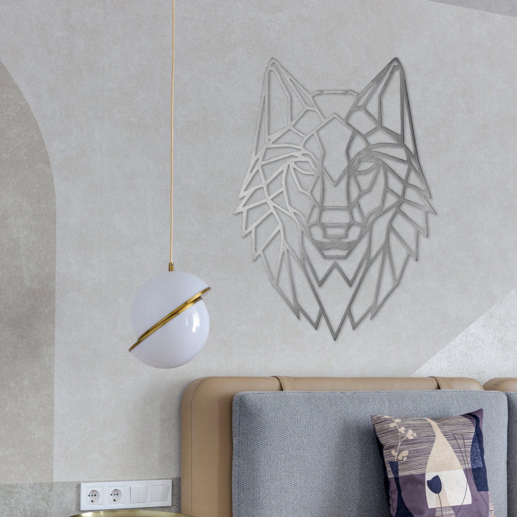 Geomtric wolf metal wall decor mounted on a bedoom wall