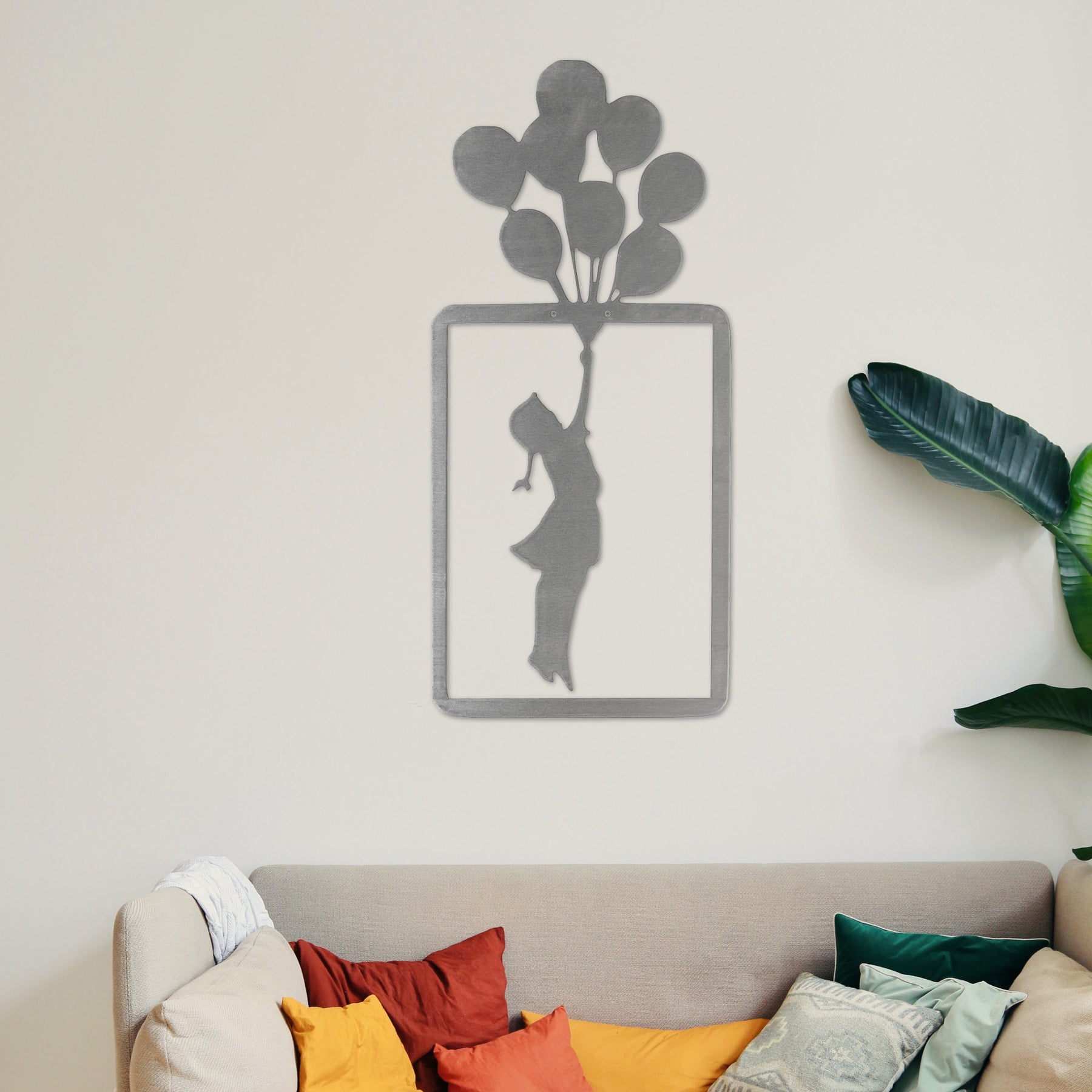 Girl with balloons - Banksy metal wall decor hanging in a sitting room