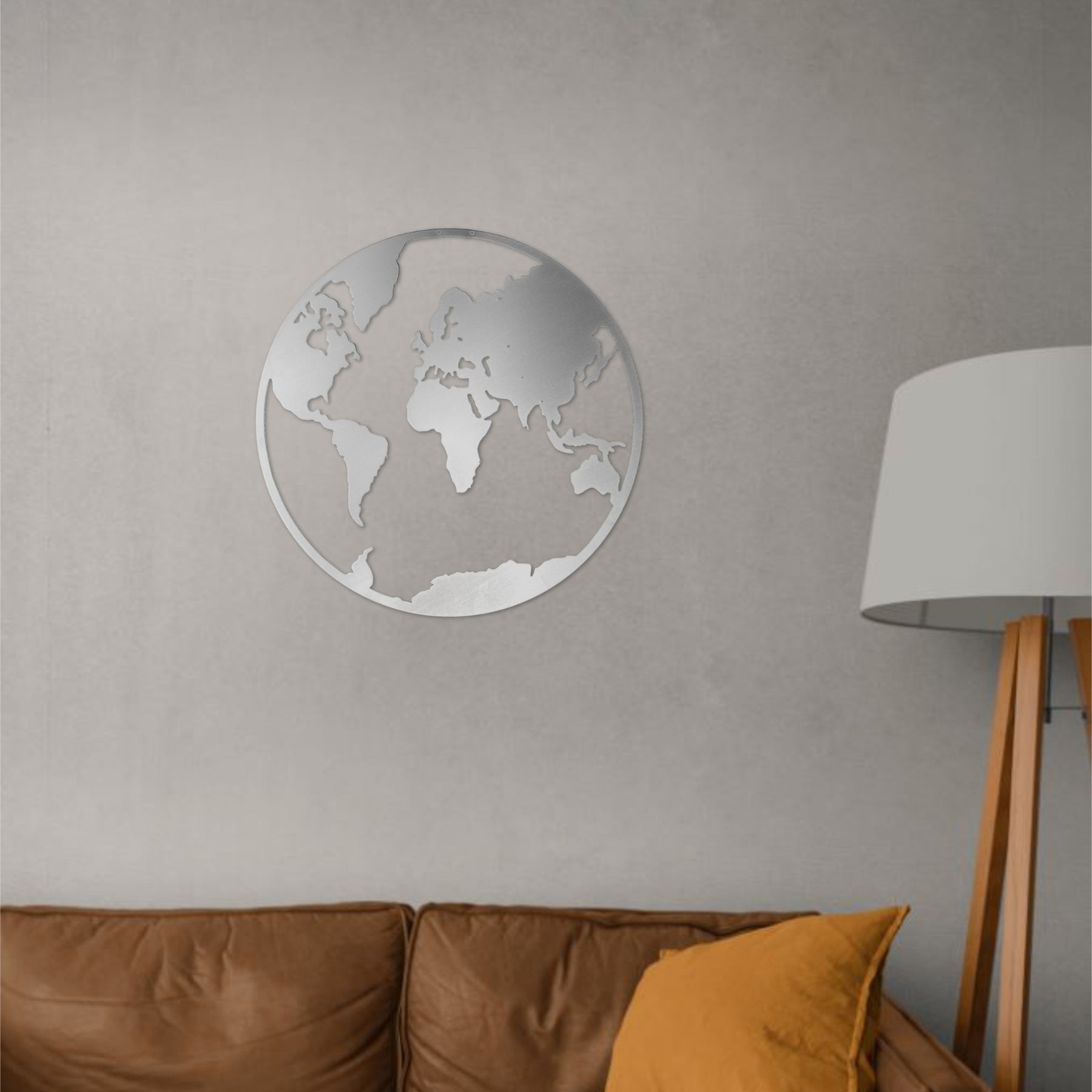 Explore the world from your wall with this Globe metal wall art. Its sleek, minimalist design features a detailed cut-out of the globe, combining modern style with a touch of wanderlust. Perfect as a standalone piece or part of a gallery display.
